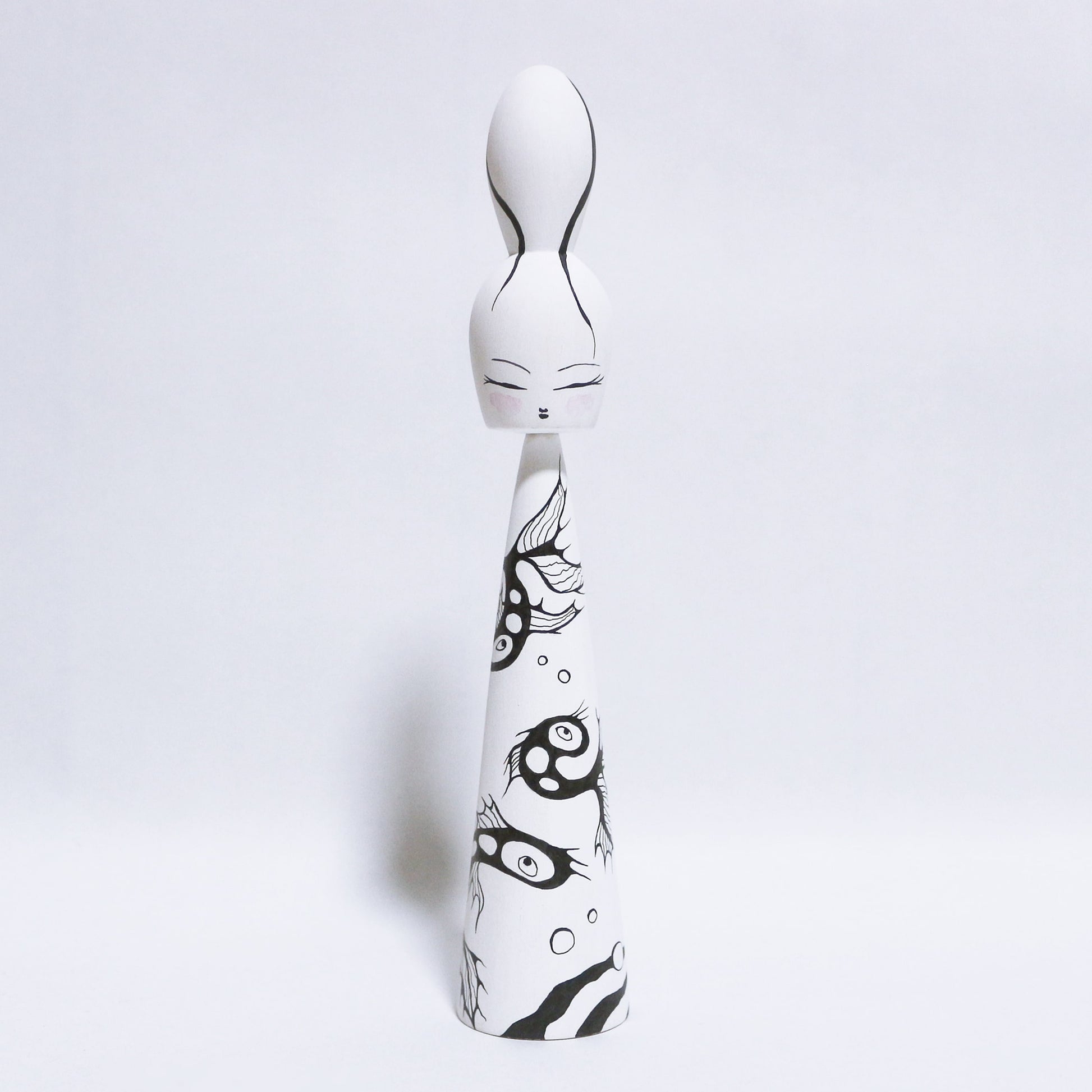 私のデザインは様々な芸術様式、文化、そして自然への愛に影響を受けています それぞれの人形の独特な形に着想を得て、スケッチをほとんど、あるいは全く行わず、直接木に絵を描きながらデザインを進化させていきました